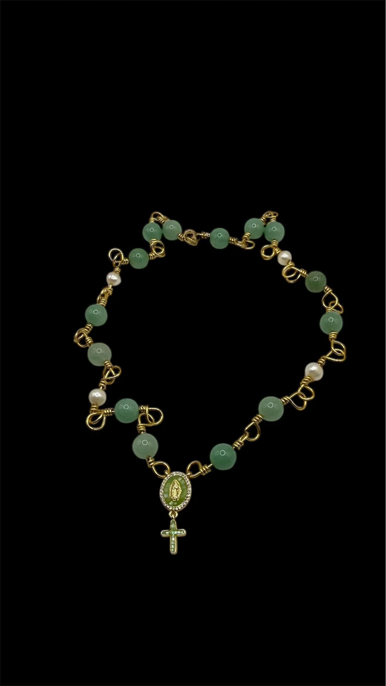 Made with green aventurine and fresh water pearls Hand linked with non tarnish copper wire. This is a mini version of my hand linked rosaries.